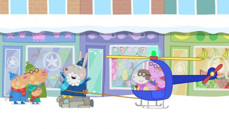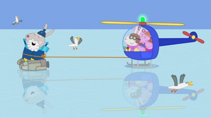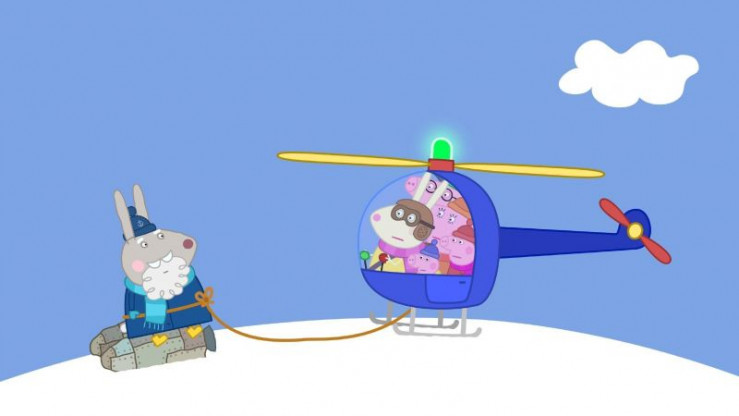 Frau Mümmel und Familie Wutz (re.) haben Opi Mümmel (li.) mit einem Hubschrauber von einem schneebedeckten Berg gerettet, nachdem er mit seinem Raketenrucksack hoch hinaus schoss und dort feststeckte. +++ Die Verwendung des sendungsbezogenen Materials ist nur mit dem Hinweis und Verlinkung auf RTL+ gestattet. +++