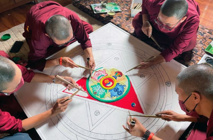 Die Nonnen der Thrangu Tara Abbey wollen ihren Teil dazu beitragen und im Tempel ein Schutz-Mandala aus farbigem Sand errichten. Mit der Fertigstellung residiert Göttin Vajrayogini - so die Vorstellung der Gläubigen - in ihrem Sandmandala-Palast. Nach einer Woche, so sind die Gläubigen überzeugt, wird sie wieder ausziehen. Danach wird das Mandala rituell zerstört. Diese Sichtweise fasst einen der Kerngedanken des Buddhismus zusammen: Nichts währt ewig. Deshalb sollte man früh lernen, alles, woran das Herz hängt, auch wieder loszulassen.