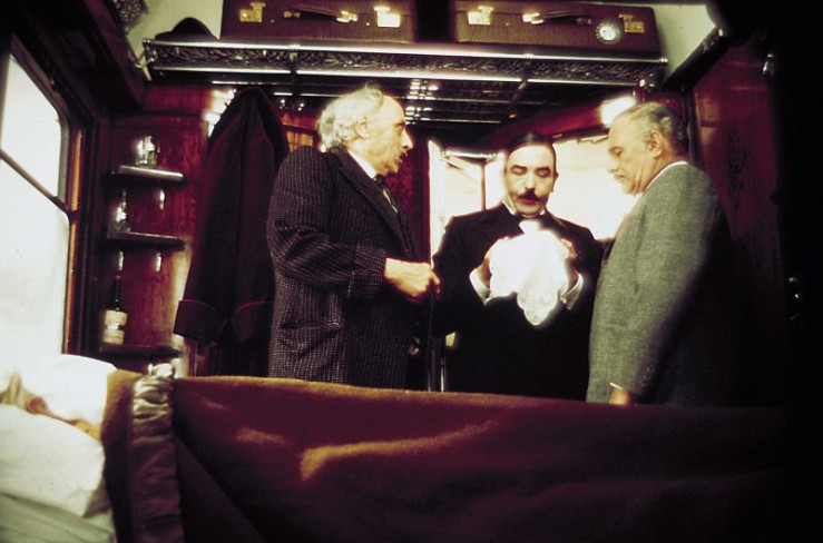 Hercule Poirot (Albert Finney, Mi.), Dr. Constantine (George Coulouris, li.) und Colonel Arbuthnot (Sean Connery, re.) begeben sich an Bord des ?Orient-Express? einem Verbrechen auf die Spur.