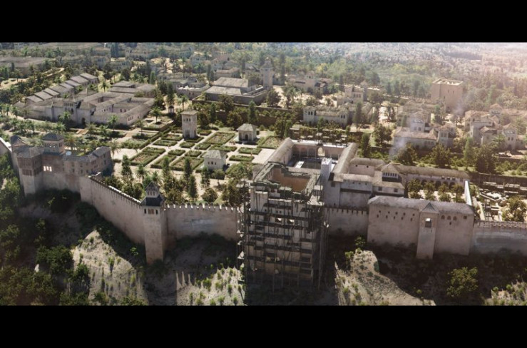 Verse von Ibn al-Khatib (re.) und Ibn Zamrak (li.) schmücken die Wände der Alhambra (Spielszene).