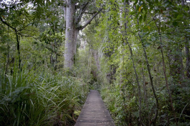 Ein Holzsteg führt Wanderer durch den Kauri-Wald.