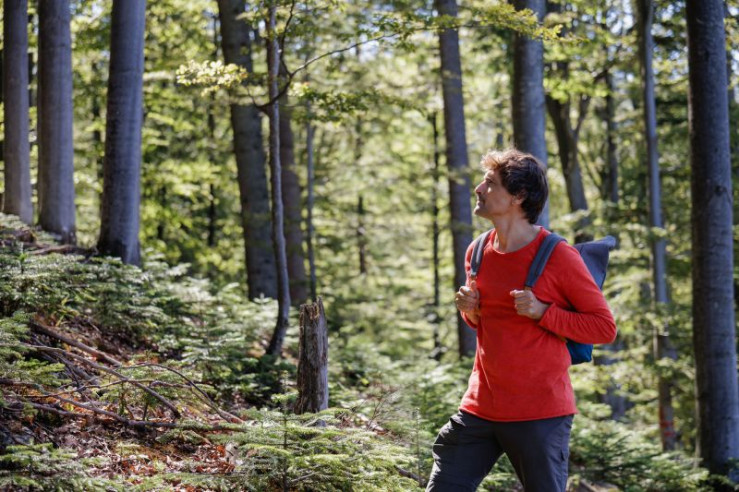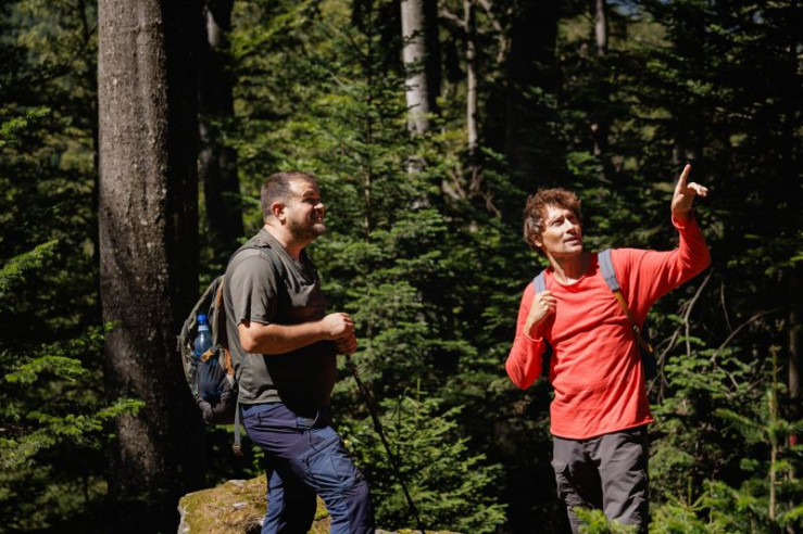 Uli Kunz (r.) und der rumänische Umweltschützer Ion Holban (l.) stehen im rumänischen Wald. Sie sind mit Rucksäcken bepackt und Ion Holban hält einen Wanderstab in der Hand.