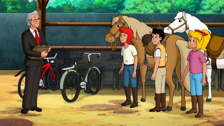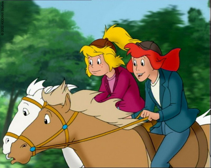 Weil Bibi in Neustadt schon Ferien hat, kann sie Tina und Alexander am letzten Schultag in die Schule in Falkenstein begleiten - mit den Pferden. Aber Lehrer Krähwinkel hat Angst vor Pferden.