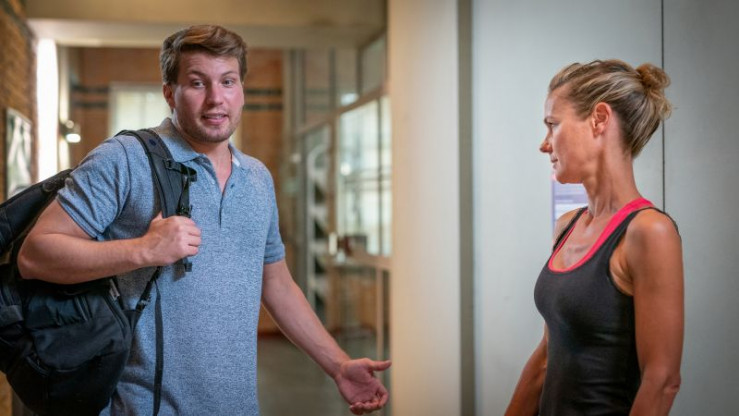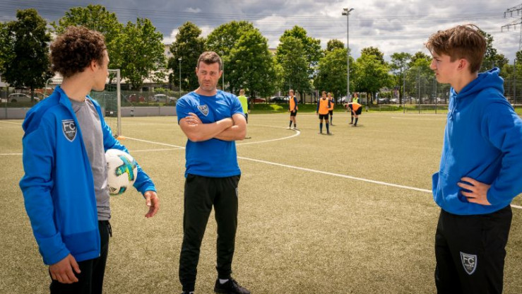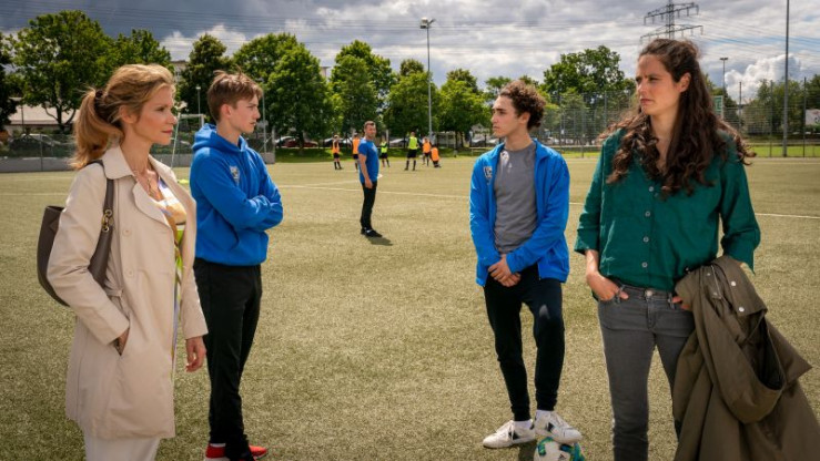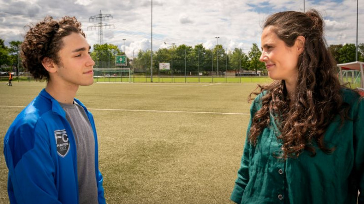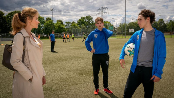 Trainer Noah Kruse (Jörg Rohde, M.) muss eine Entscheidung treffen. Nominiert er Dominik (Riccardo Campione, l.) oder Lennard (Luke Matt Röntgen, r.) für die Junioren-Bundesliga?