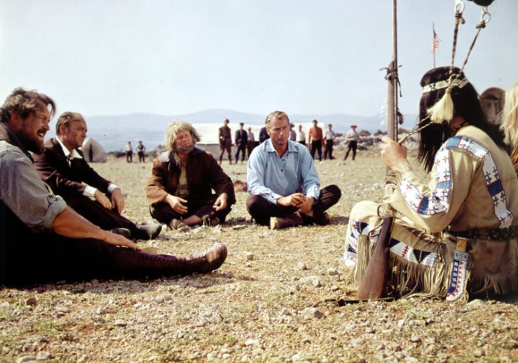 Bill Jones (Walter Barnes, l.), Bancroft (Branko Spoljar, 2.v.l.), Sam Hawkens (Ralf Wolter, M.), Old Shatterhand (Lex Barker, 2.v.r.) und Winnetou (Pierre Brice, r.) beratschlagen sich.