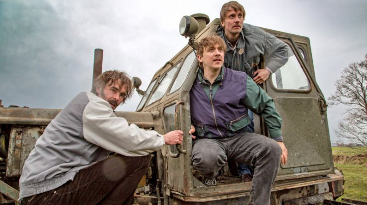 "Auf und davon": Wolfgang Hilgert (Andruscha Hilscher, l.), Jürgen Zorn (Michael Sosna, M.), Hans Joachim Zorn (Florian Donath, r.) wollen die innerdeutsche Grenze mit einer Planierraupe aus dem Fuhrpark der grenznahen Sandwerke durchbrechen. Ein lauter, langsamer Koloss. Und kaum zu übersehen.