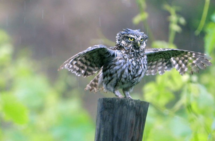 Ein Steinkauz genießt die willkommene Regendusche.