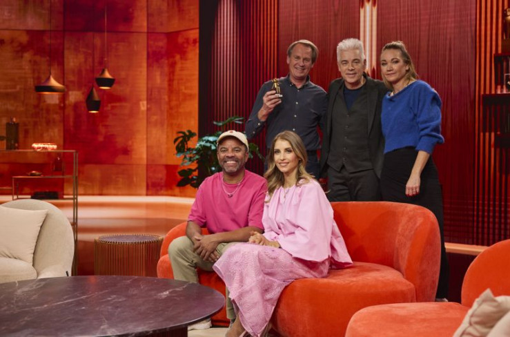 Hinten von links: Markus Wasmeier, Michael Mittermeier und Lisa Maria Potthoff. Vorne von links: Simon Pearce und Cathy Hummels. Weiteres Bildmaterial finden Sie unter www.br-foto.de.