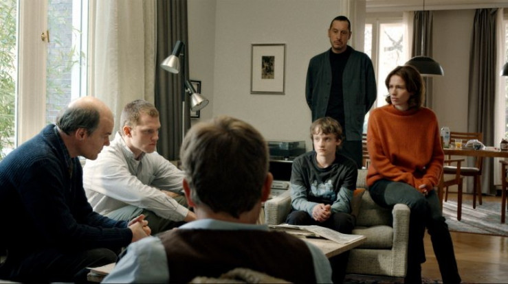 Die Polizisten Vera (Yorck Dippe, l.) und Nickel (Enno Trebs, 2. v. l.) besprechen mit der Familie - Johann (Claude Heinrich, sitzend) und Ann Kathrin (Adina Vetter, r.) - das weitere Vorgehen. Beistand bekommen sie von Rechtsanwalt Schwenn (Justus von Dohnányi, v.) und Christian Schneider (Hans Löw, stehend).