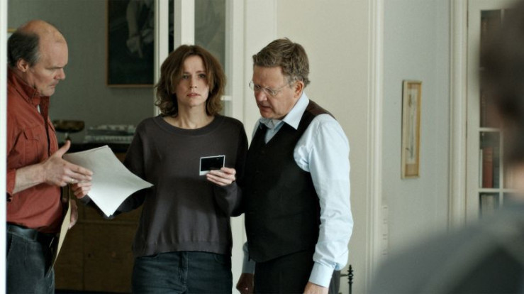 Ein erstes Erpresserschreiben trifft ein: Polizist Vera (Yorck Dippe, l.) und Rechtsanwalt Schwenn (Justus von Dohnányi, r.) teilen die Sorge Ann Kathrin Scheerers (Adina Vetter).