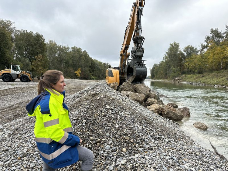 Viola Frietsch, Projektleiterin beim Wasserwirtschaftsamt Donau-Wörth, am Lech nördlich von Augsburg. Im Hintergrund: Renaturierung des Lechs.