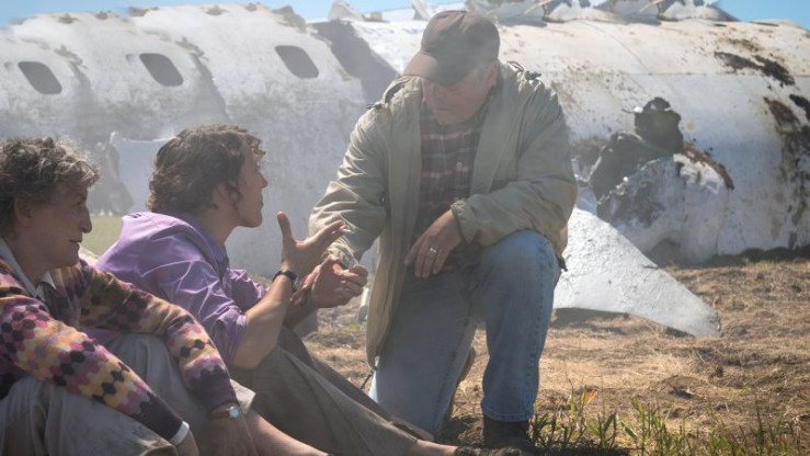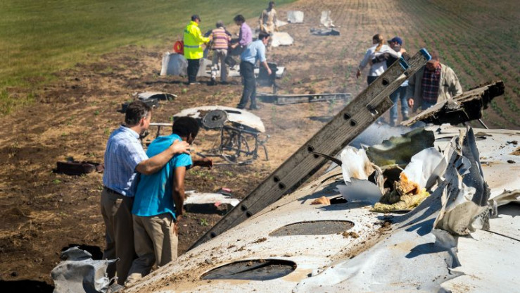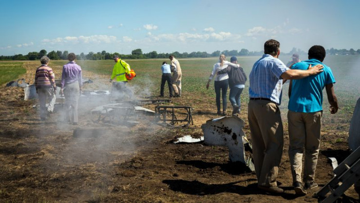 Die Ersthelfer und einige Zivillisten führen die Überlebenden vom Wrack des Flugzeugs weg.