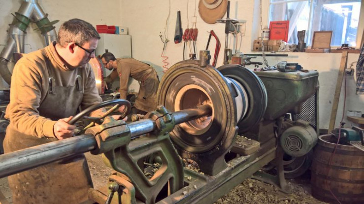 In der Münchener Fassmacherei schleift Scheffler Jörg Schnepper die Längshölzer der zukünftigen Bierfässer, um die Unebenheiten im Holz zu entfernen.