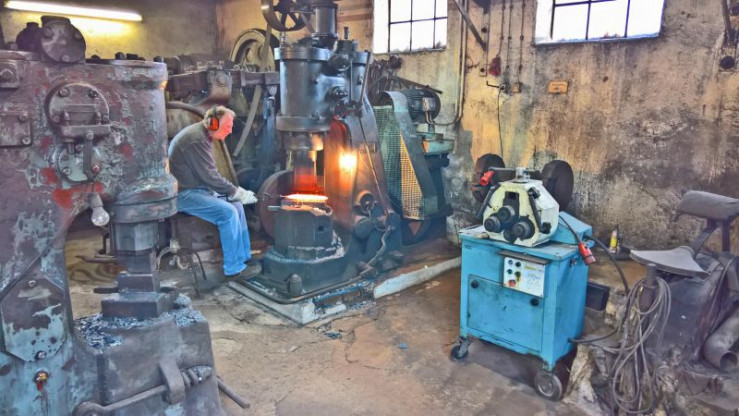Josef Kindermann bearbeitet am Breithammer eine der bekannten "Waidlerpfannen".