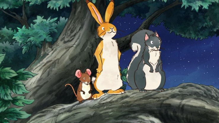 Großer brauner Hase, kleiner brauner Hase und die kleine Feldmaus betrachten den Sternenhimmel.