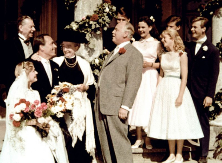 Onkel Pankraz (Hans Nielsen, Mitte) gratuliert seiner Tochter Margot (Karin Andersen, li.) zu ihrer Hochzeit mit Jochen von Roth (Paul Kliner, 3. v. re.). Der reiche Winzer hat außerdem Oma Jatzens (Margarethe Haagen, 4. v. li.) Immenhof gerettet. Die Zukunft von deren Enkeln Dick (Angelika Meissner-Voelker) und Dalli (Heidi Brühl, re.) ist damit gerettet. Cousin Ethelbert (Matthias Fuchs, re.) hatte an dieser Rettung maßgeblichen Anteil.