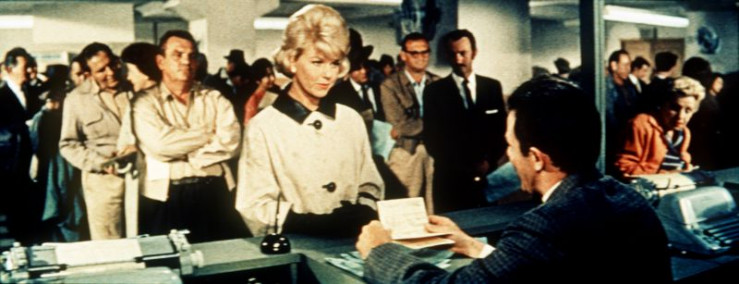 Cathy (Doris Day, m.) spricht nur äußerst ungern bei ihrem aufdringlichen Arbeitsvermittler Mr. Everett Beasley (John Astin, r.) vor.