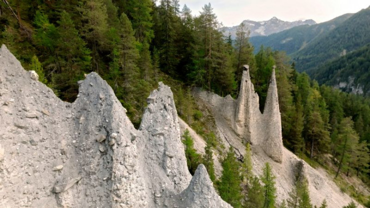 Auch Trail-Läuferin Fränzi kennt die Geschichten rund ums Val Sinestra. Fränzi ist mit ihren Hündinnen Moira und Tipony gern rund um die Postautoroute unterwegs. Sie liebt es, in das Postauto zuzusteigen, irgendwo auf der Strecke auszusteigen und mit den Tieren durchs Gelände zu laufen. Fränzi zeigt dem Filmteam ein ganz besonderes Naturspektakel: die uralten Erdpyramiden im Val Sinestra.
