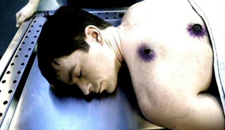 Dr. Sheldon Hawkes (Hill Harper) findet heraus, dass George Kolovos (Paul Papadakis, liegend) mit einer antiken Waffe erstochen wurde. +++ Die Verwendung des sendungsbezogenen Materials ist nur mit dem Hinweis und Verlinkung auf RTL+ gestattet. +++