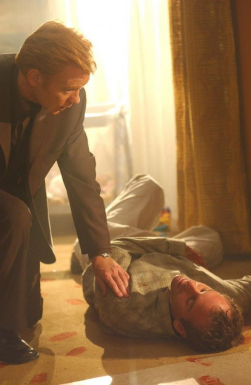 Im Wohnzimmer findet Horatio (David Caruso, l.) den leblosen Körper der Mutter und den Vater Jason Caplin(Albie Selznick), der zwar schwer verletzt ist, aber noch lebt. +++ Die Verwendung des sendungsbezogenen Materials ist nur mit dem Hinweis und Verlinkung auf RTL+ gestattet. +++