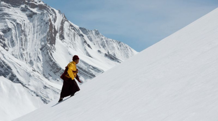 Ein buddhistischer Mönch geht auf eine Meditationshöhle zu, Spiti-Tal, Indien