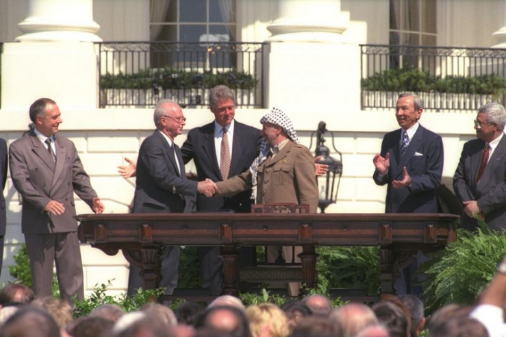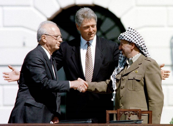 Unter der Vermittlung von US-Präsident Bill Clinton (M.) reichen sich der israelische Ministerpräsident Yitzhak Rabin (l.) und PLO Chef Yasir Arafat (r.) am 13. September 1993 die Hand. Die Unterzeichnung des Oslo-Abkommens ist ein Zeichen der Hoffnung für Frieden im Nahen Osten.