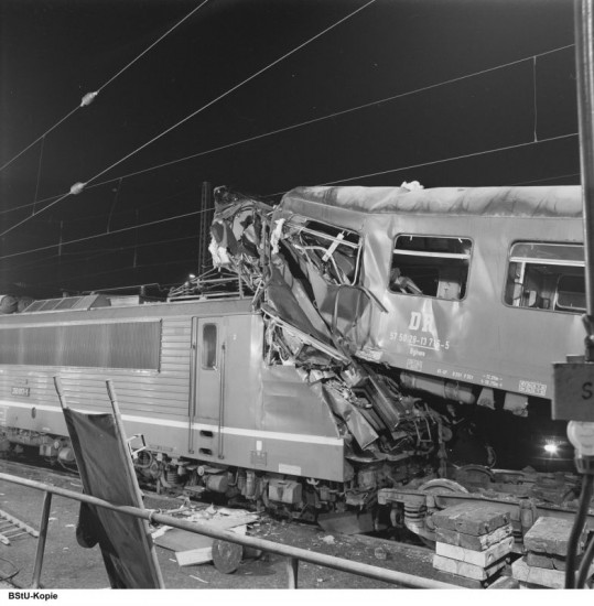 1984 raste ein Transitzug Richtung Westdeutschland in einen stehenden Pendlerzug. Transitzüge durften in der DDR wegen möglicher "Republikflucht-Versuche" nicht langsam fahren oder halten. So übersah der Zugführer im dichten Nebel ein rotes Signal. Das kostete elf Menschen das Leben.