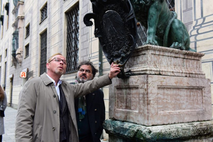 Ludwig Schaller (Alexander Held, l.) zeigt seinem italienischen Kollegen Commissario Quehenberger (Antonio Putignano, r.) die Stadt München und eine Statue Ludwig I.