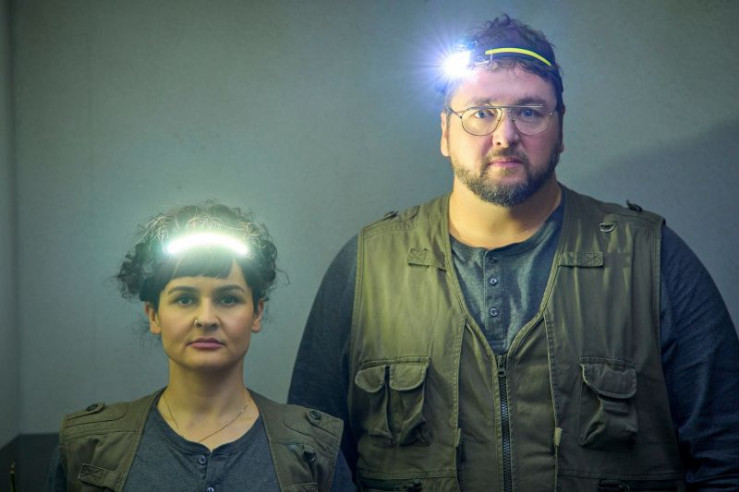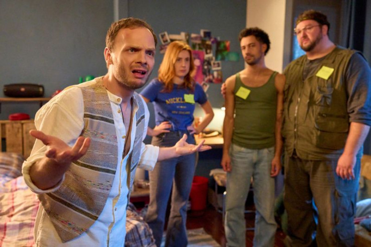 Yannik (Rojan Juan Barani, l.) erschrickt, als er im dunklen Hausflur auf Tüffi (Daniel Zillmann, r.) trifft.
