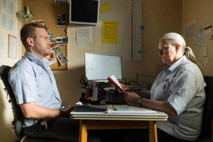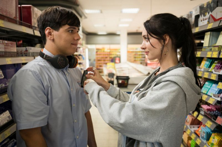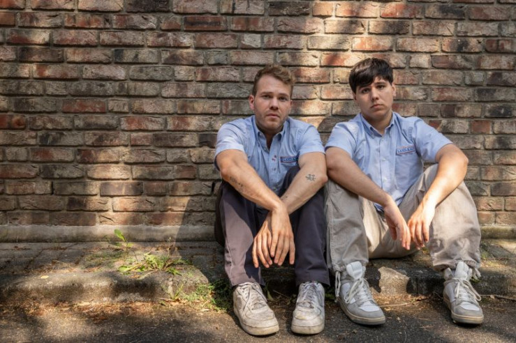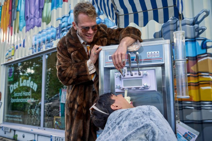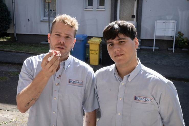 Julian (Ben Münchow, l.) und Ernst Hakke (Diyar Ilhan, r.) gönnen sich eine absurde Pause: Softeis direkt aus der Maschine - ein Highlight an Ernsts Tag der Entscheidungen.