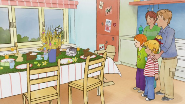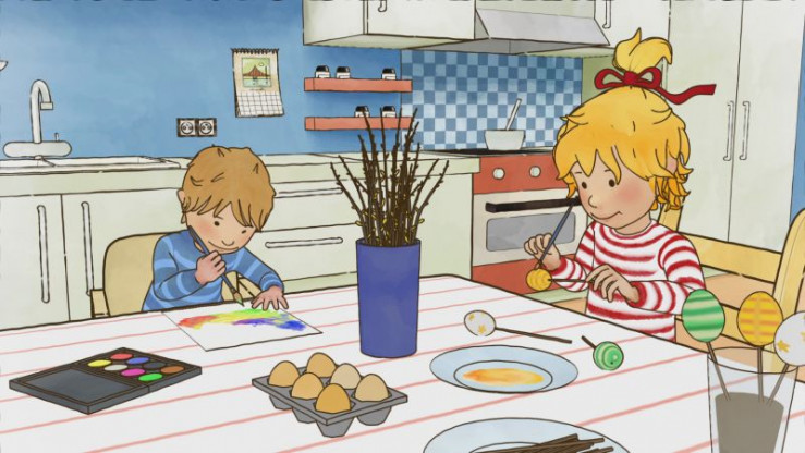 Eifrig helfen Conni und Jakob bei den Vorbereitungen für das Osterfest. Sie bemalen Ostereier, basteln Schmuck für den Osterstrauß und möchten sogar einen Kresse-Tisch wachsen lassen.
