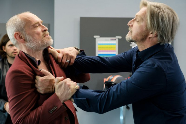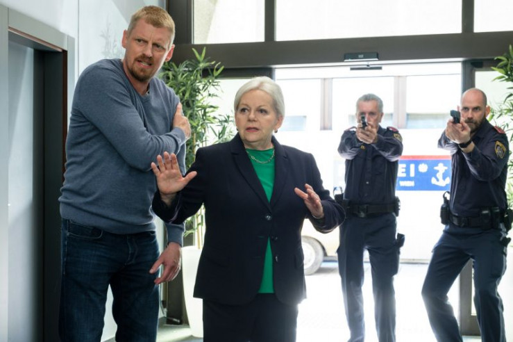 Major Max Herzog (Martin Gruber, l.) wird von Ludwig Pichler angeschossen, als dieser Gio Egger in Gewalt nimmt. Daneben stehen Oberst Henriette Wolf (Brigitte Kren, 2.v.l.) und zwei Polizisten (Komparsen, r.).