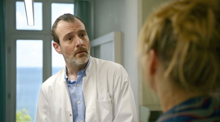 Dr. David Mandel (Marco Girnth, li.) hat sich verlertzt und kommt in die Praxis zu Nora Kaminski (Tanja Wedhorn, Mitte) und Mandy Petersen (Morgane Ferru).
