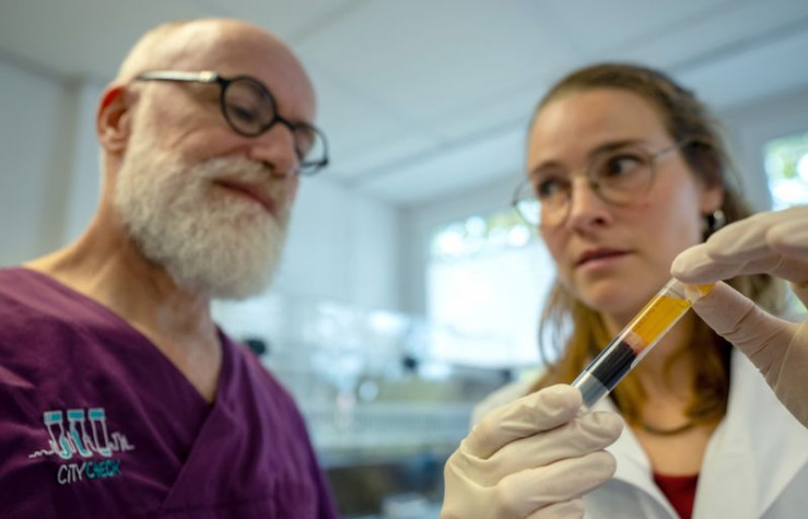 Der Arzt Thomas Lutz erklärt Helena Brinkmann, wie das Blut auf Syphilis untersucht wird und führt sie durch das Labor der Infektionsambulanz in Frankfurt.