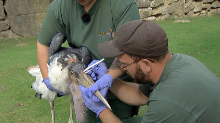Pelikandame Dori aus dem Opel-Zoo wird von Pflegerin Mona de Vries und ihrer Kollegin Anna gefüttert.