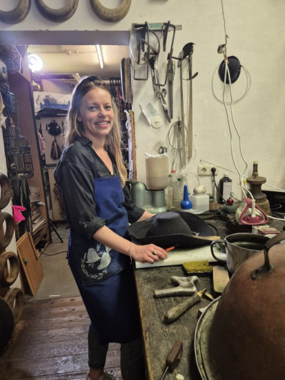 Hutmacherin Marietta Gollé vom "Hut-Schätz" in Tegernsee in ihrer Werkstatt.