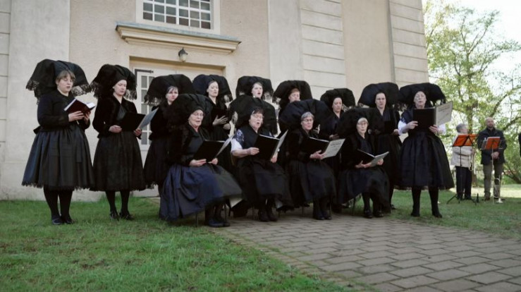 Von den Ostersängerinnen, die in der Osternacht mit Chorälen die Auferstehung des Herrn verkünden, bis hin zur kunstvollen Verzierung sorbischer Ostereier: Die filmische Spurensuche zeigt, wie althergebrachte Rituale heute von einer neuen Generation mit neuem Leben erfüllt werden. - Ostersängerinnen vor der Sielower Kirche.
