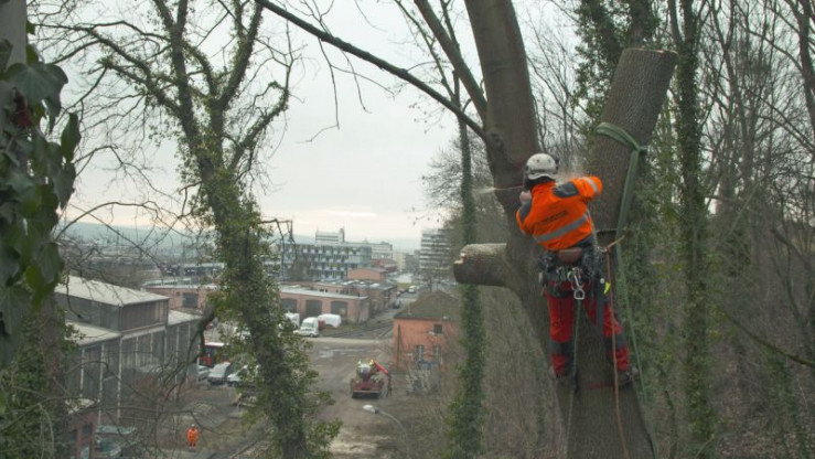 Die Experten müssen am Hauptbahnhof in Kassel ran: Hier führen Gleise entlang eines bewaldeten Steilhangs. Die Oberleitungen befinden sich in direkter Baumnähe.