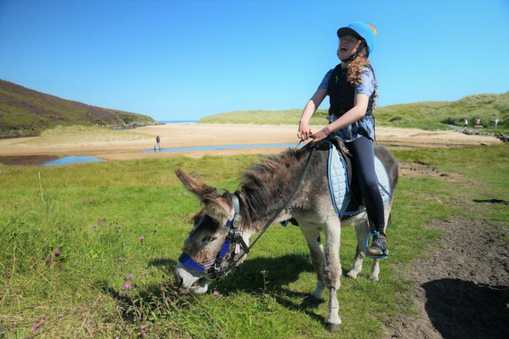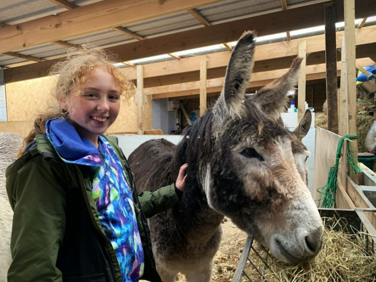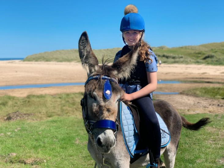 Mia ist stolz darauf, dass sie ihren Esel Jimmy an Zaumzeug und Sattel gewöhnen konnte und dass er sie nun aufsitzen lässt.