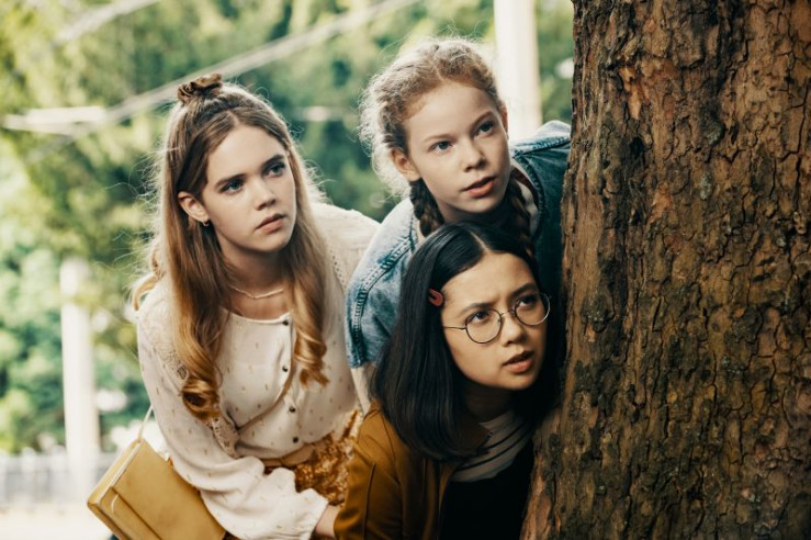 Der Detektivclub mit Marie (Lilith Johna, links), Franzi (Bella Bading, 2. von links) und Kim (Purnima Grätz, rechts) trifft sich zum ersten Mal.