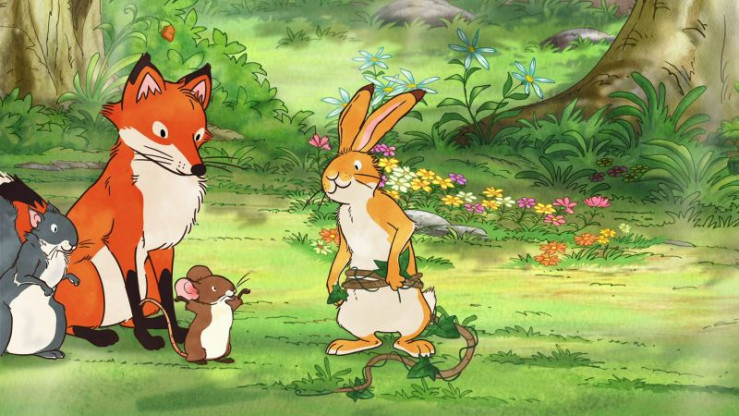 Die Freunde haben für den kleinen braunen Hasen einen Schwanz aus einer Efeuranke gebastelt.