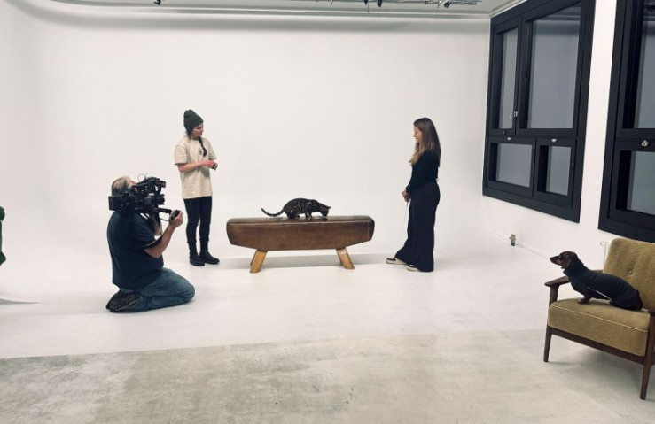 Fränze Lüttich (2.v.l.) am Set mit einer trainierten Katze.