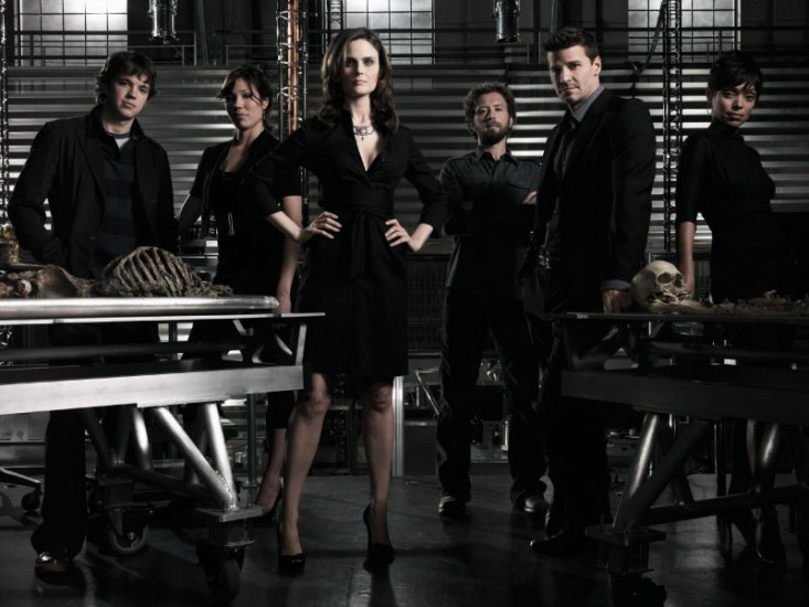 (v.li.) TJ Thyne, Michaela Conlin, David Boreanaz, Emily Deschanel, Eric Millegan und Tamara Taylor.