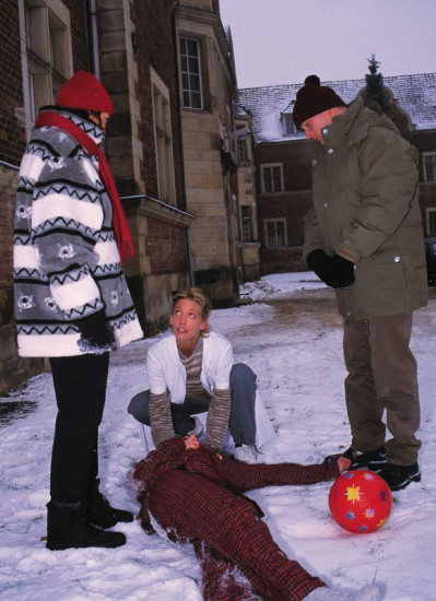 Im Garten des neurologischen Pflegeheims wird die Patientin Franziska Spartmann (Komparsin, lieg.) gefunden. Schwester Karin (Christina Greb) kommt jedoch zu spät - das Mädchen ist tot (li. und re. Komparsen).