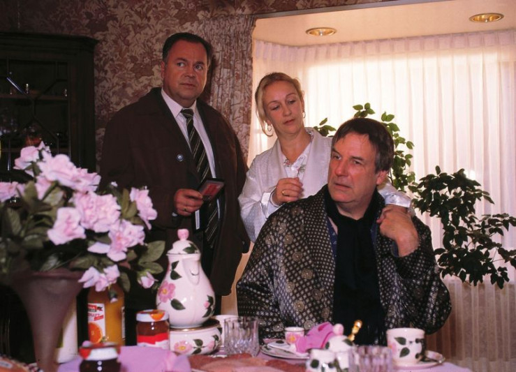 Kommissar Stefan Kehler (Wolfgang Bathke, l.) hat eine tragische Nachricht für Elfi (Cornilia Lippert) und Karl Spartmann (Hubert Mulzer): Ihre Tochter wurde tot aufgefunden...