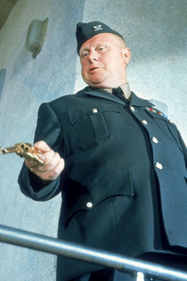 Goldfinger (Gert Fröbe, l.) ist es mit Hilfe der Pilotin Pussy (Honor Blackman) gelungen, James Bond (Sean Connery) gefangen zu nehmen.