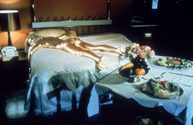 "Goldfinger" hinterlässt seine Visitenkarte: Jill Masterson (Shirley Eaton) zahlt ihren Verrat mit dem Tod.