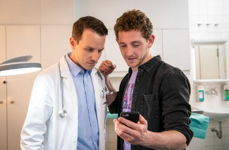 Kevin (Konstantin Frank, r.) zeigt Dr. Jan Kühnert (Marc Dumitru) die Bilder der Verletzung auf seinem Smartphone.