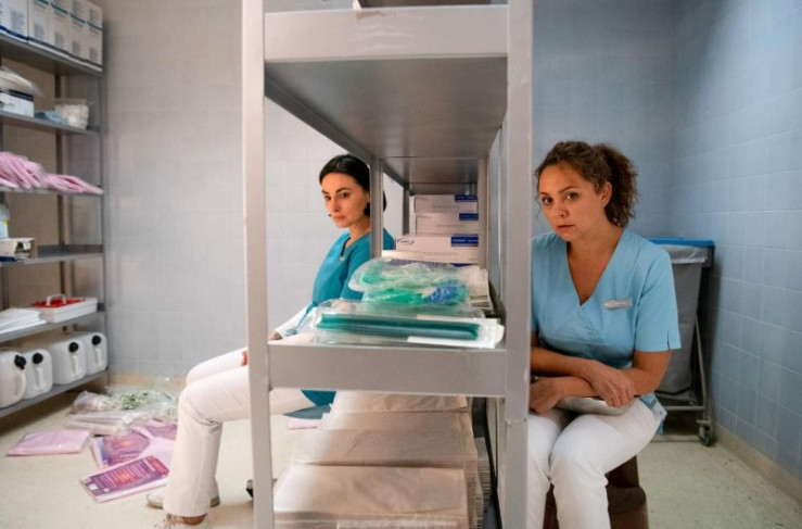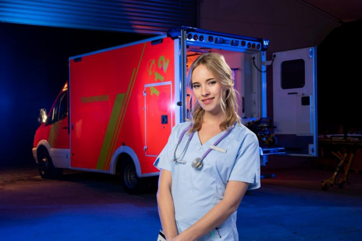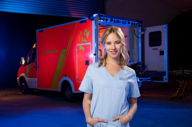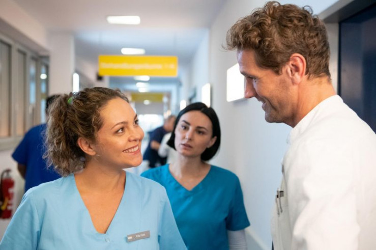 Dr. Sebastian Sander (Oliver Franck, l.) kann Patientin Caro Behrend (Merle Collet, liegend) mit Hilfe von Dr. Leonie Mertens (Linda Marlen Runge, M.) und Ella (Ines Quermann, r.) in letzter Sekunde retten.