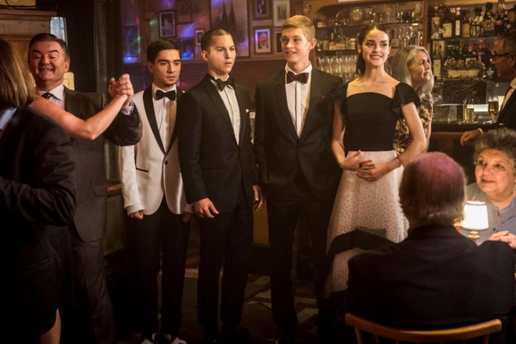 V.l.: Toni (Ivo Kortlang), Leo (Tim Olvier Schultz), Jonas (Damian Hardung) und Emma (Luise Befort) sind auf einem Abschlussball. Emma will, dass Leo seine Tanzkünste zum Besten gibt.